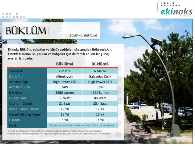 You can use easily these solar powered lamps in anywhere having unlimited use area thanks to durable structure and appropriate to any kind of ambient conditions, avenues, streets, structure ambiances, green fields and anywhere that needs light. Thanks to EKİNOKS® Solar Powered Lamps extremely easy to mount, also you will get rid of heavy and costly works such as run power cables to ambiance for your light need. As ambiance lighting power, as they are not different from lamps working with standard electricity, removes also your need as lamp changing with 30.000 hours of life. Also thanks to long life, special batteries, you will enjoy to have free light without care for years.
